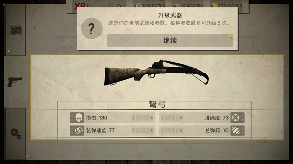 2、在升级武器界面查看弩的参数,了解其伤害装填速度等属性,为后续战斗选择武器做参考。