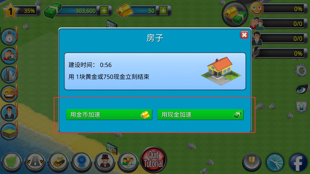 4、建筑建设需要时间,若想加快进度,可选择用金币加速或用现金加速,让建筑更快建成,完善城市。