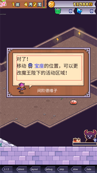 2、查看间阶德锤子的提示,了解移动宝座位置的功能,通过调整宝座来改变魔王的活动区域,优化城堡布局。