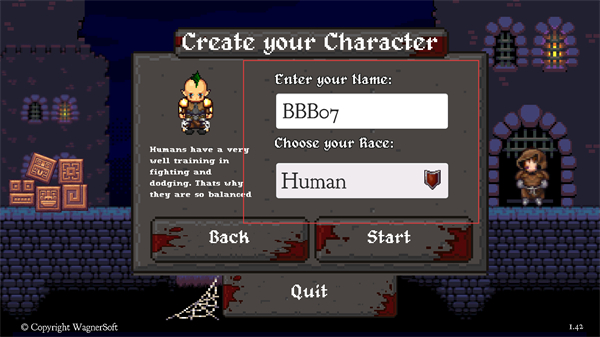 1、在角色创建界面输入名字,选定Human形象,点击Start按钮,完成角色创建并进入冒险。