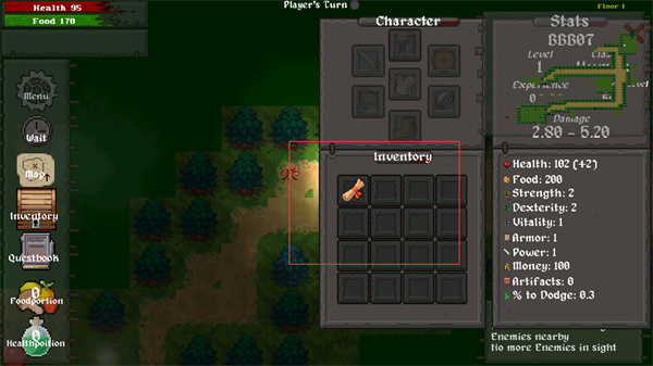 4、打开Inventory界面,将获取的木棍存入背包栏位,同时查看角色属性面板的数值变化。