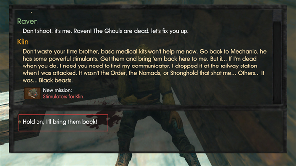 4、点击Hold on,ill bring them back选项接下新任务,准备前往获取药剂并带回给Klin。