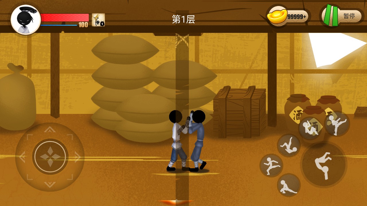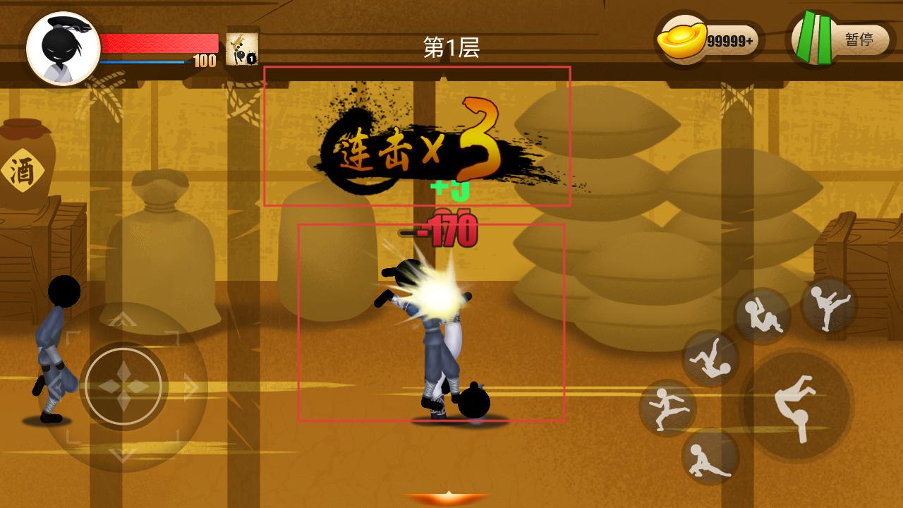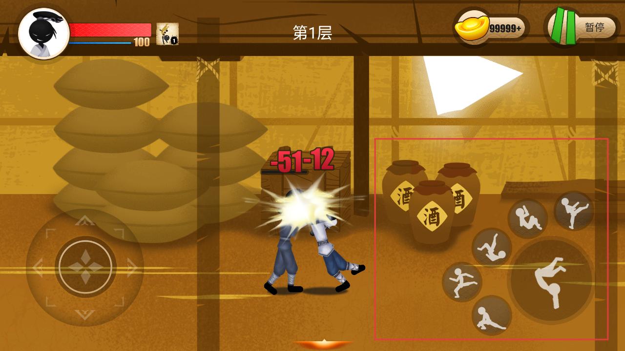 3、战斗时点击右侧攻击按钮,施展各种功夫动作,与敌人展开激烈格斗,尝试打出连击。