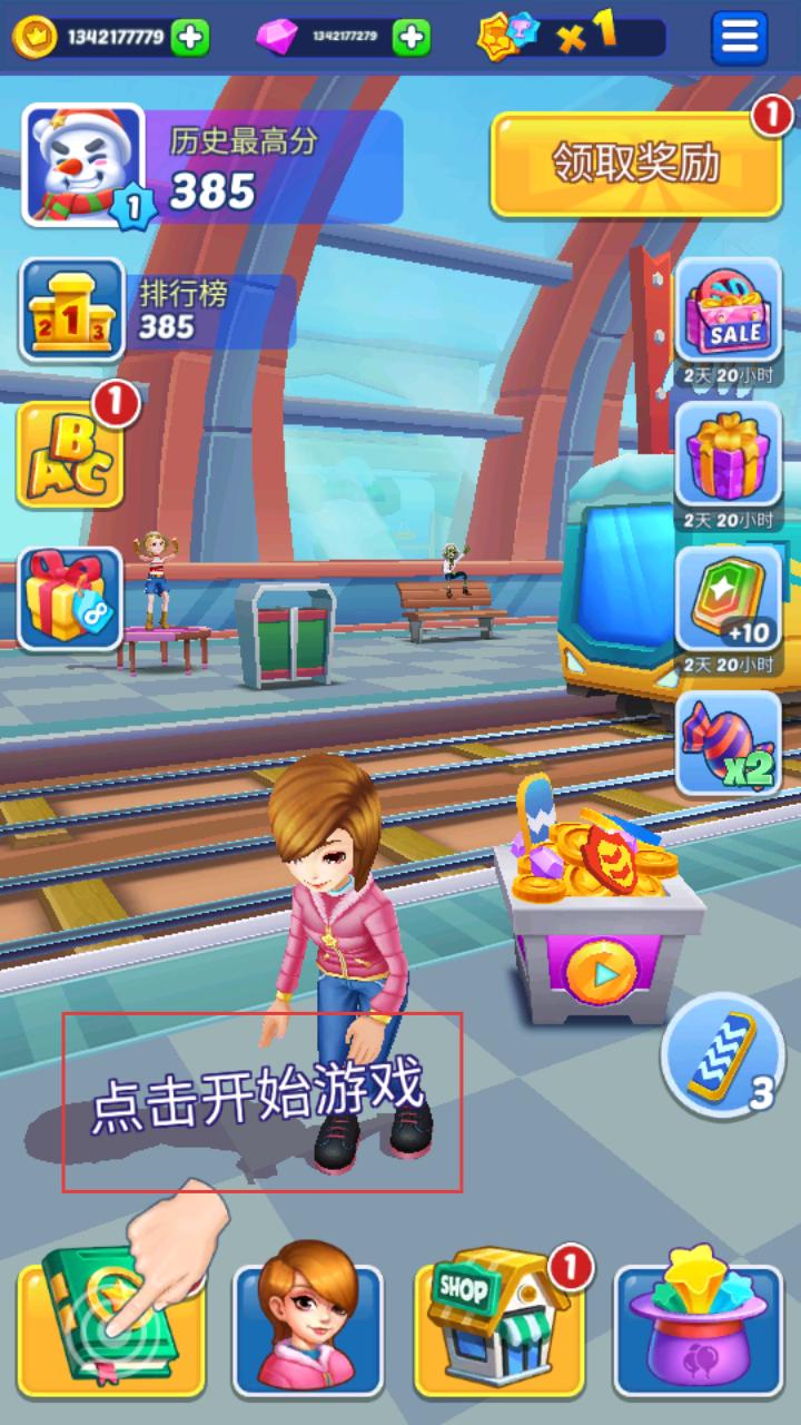 1、在主界面能看到历史最高分、排行榜,点击开始游戏进入跑酷,还有领取奖励、商店等功能板块,丰富游戏体验。