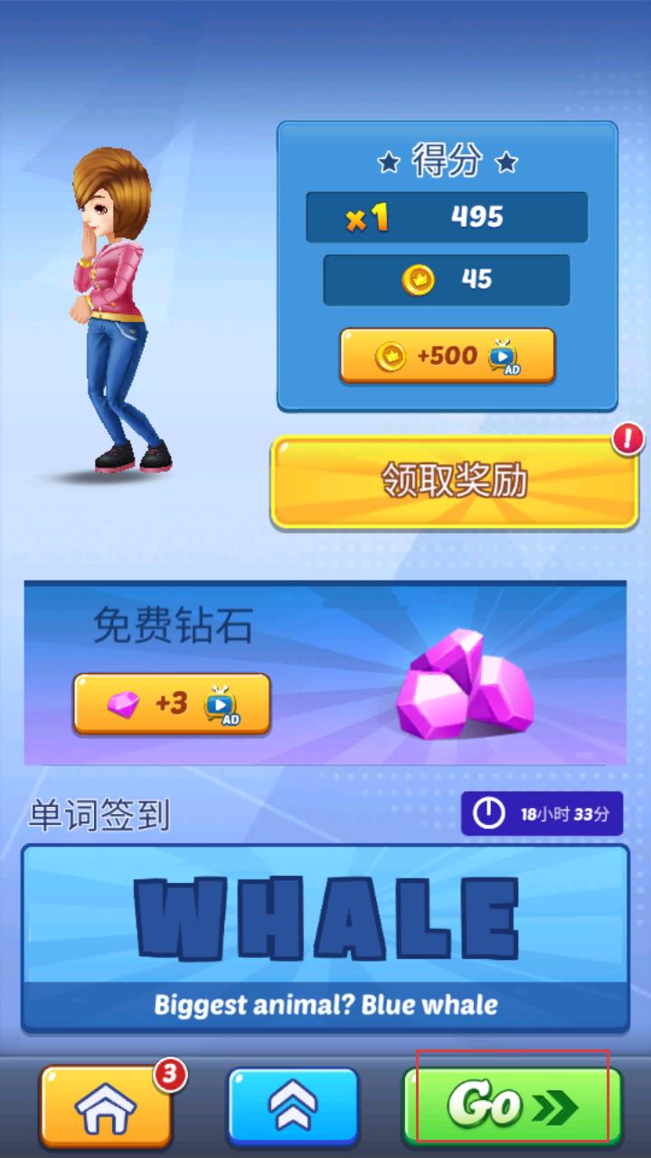 4、进入界面可查看得分、金币等信息,点击领取奖励能获取游戏资源,还有免费钻石和单词签到板块,点击Go可开启跑酷。