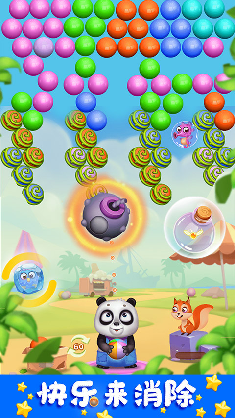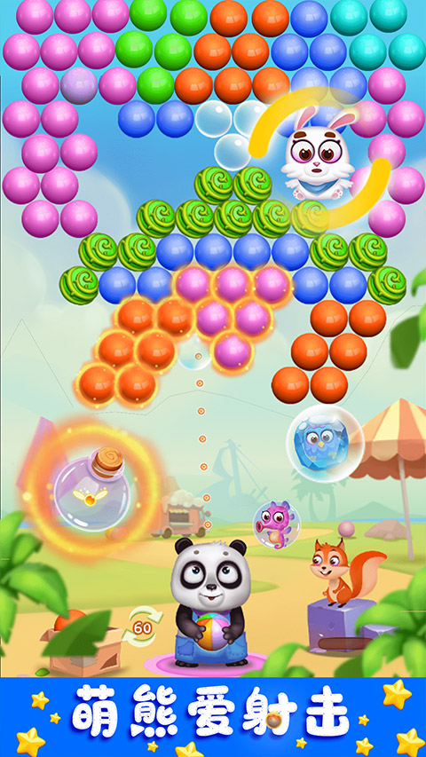 2、点击屏幕控制萌熊瞄准发射同色泡泡,使相同颜色球体相连实现消除,在有限操作次数内完成目标。
