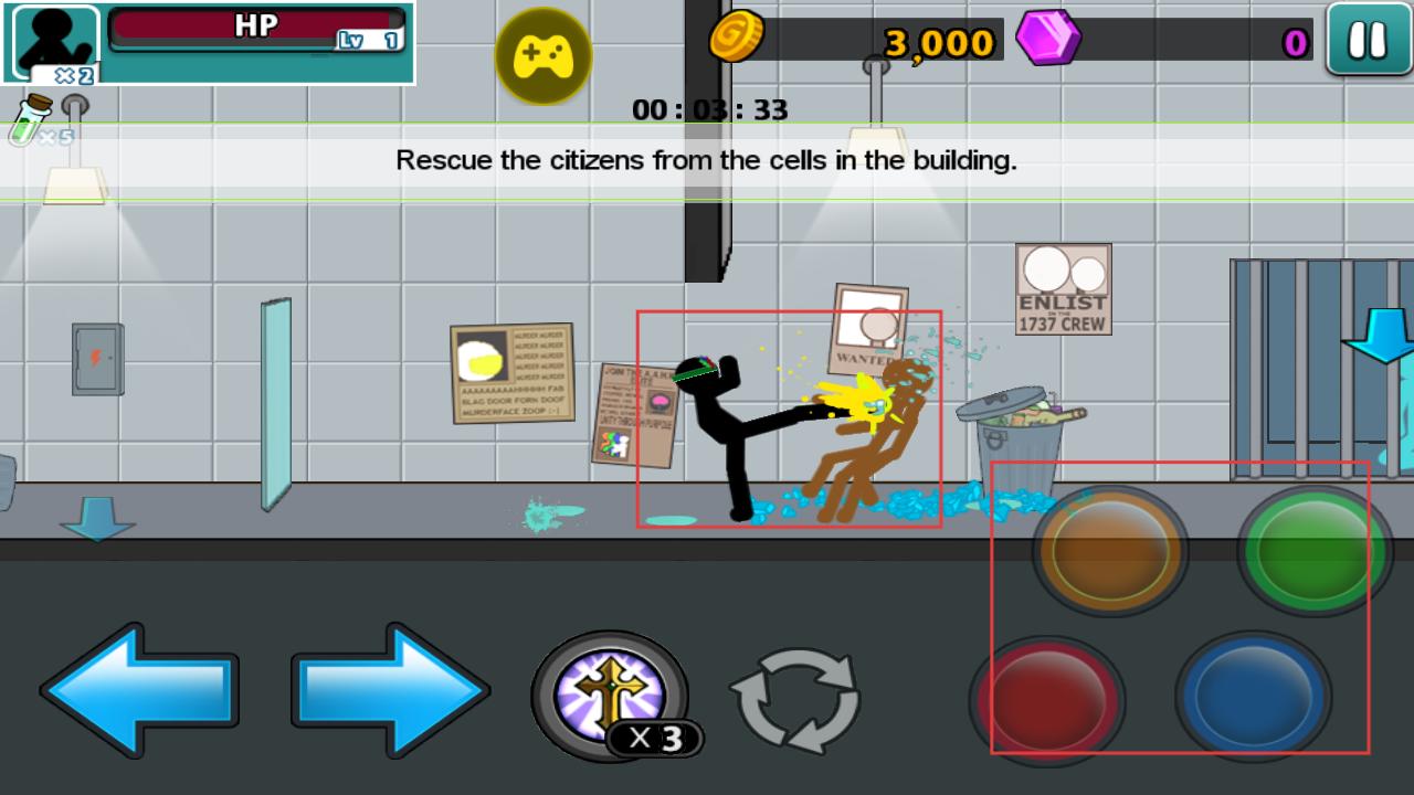 3、战斗中操控火柴人踢击敌人,利用右侧攻击按钮释放招式,击败源源不断的敌人,推进闯关进程。