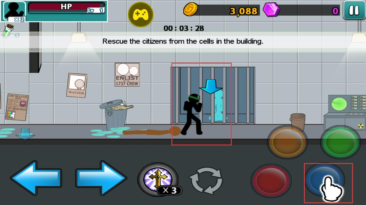 4、在建筑中找到关押市民的牢房,点击蓝色按钮打开牢门,完成救援市民的任务,继续深入关卡探索。