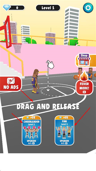 1、初始界面拖动角色瞄准篮筐,可升级啦啦队、粉丝提升助力,点击开始游戏发射篮球。