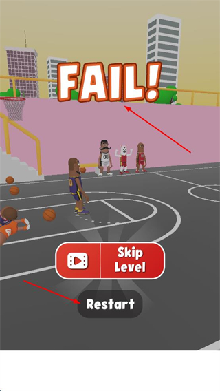 4、若投篮游戏关卡失败,可以选择看广告跳过本关或重新开始,积累经验后再挑战。