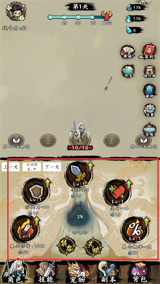 2、在第1关界面可对防御、攻击等模块升级培养,提升角色战斗力,还能选择上一关、下一关进行关卡挑战,推进修真关卡进程。