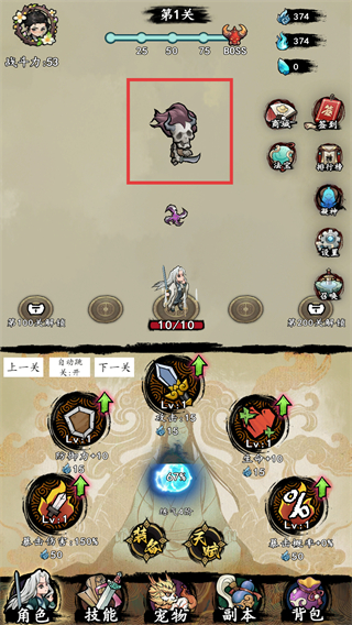 3、关卡中会出现骷髅等怪物,需操控角色与之战斗,通过角色培养和策略搭配击败怪物,继续修真关卡的冒险。