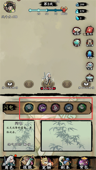 4、到第3关可使用闪电等技能,界面有不同技能图标可选,借助技能系统助力关卡挑战,在修真过程中不断解锁新技能提升战力。