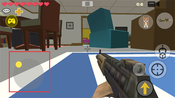 1、在House地图的室内场景中通过左侧移动摇杆控制角色移动,手持枪械探索房间,利用桌椅等环境元素,开启沙盒射击的室内冒险。