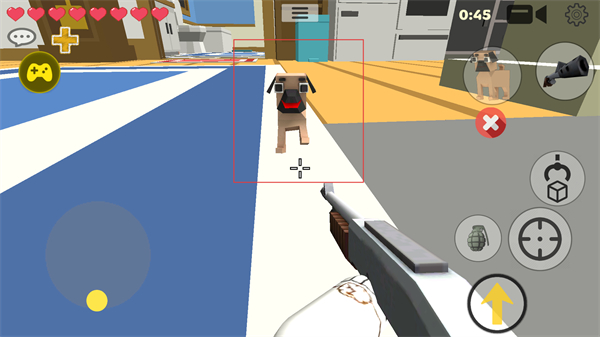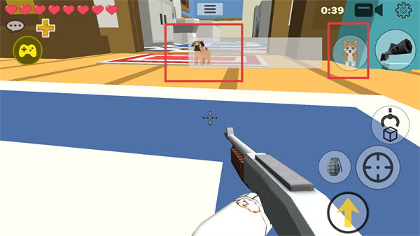 3、瞄准场景中的小狗,进行射击操作,击中后获得反馈,在室内环境中通过射击宠物类目标,推进沙盒射击的游戏进程。