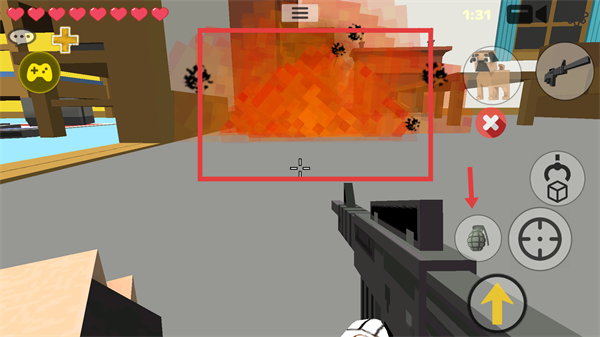 4、点击右侧手雷按钮投掷手雷,引发爆炸造成场景破坏,利用爆炸效果丰富战斗策略,体验沙盒射击中的破坏玩法。