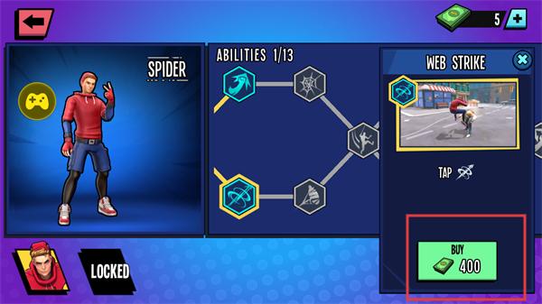 2、在能力界面,花费400金钱购买WEB STRIKE技能,解锁新的格斗招式,增强战斗手段,助力在城市中对抗敌人,提升格斗体验。