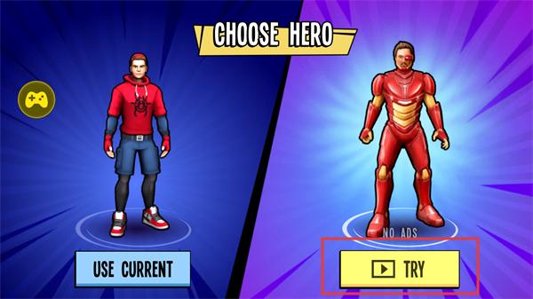 4、进入选择英雄界面,可选择不同英雄,点击TRY按钮尝试新英雄,更换角色体验不同格斗风格,丰富超英格斗的冒险选择。