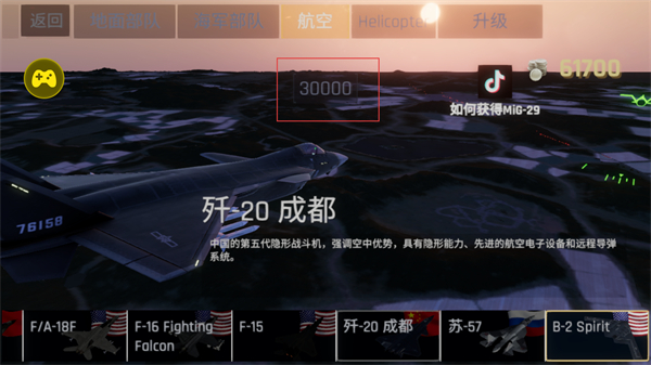 1、进入航空板块,可解锁战机,歼20是五代隐形战机,具备隐形能力和先进航空电子设备,还有多款战机可选,消耗对应资源即可解锁,打造空中作战力量。
