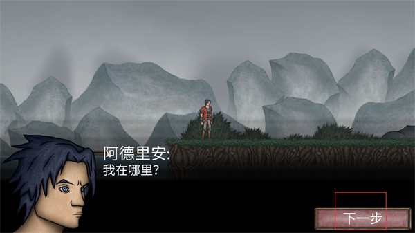 2、查看阿德里安的对话内容,了解当前处境相关的信息,点击下一步按钮,推进游戏的剧情流程。