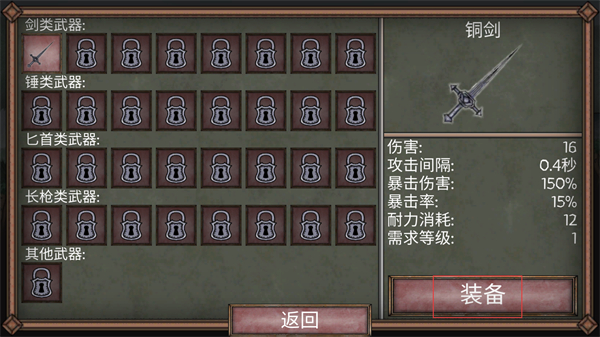 3、在武器界面找到铜剑,查看其属性信息,点击装备按钮,将这把武器配备到角色身上提升战力。