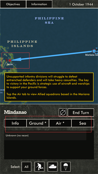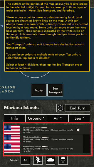 2、查看Mariana Islands的地面兵力列表,选择对应单位,准备通过下方按钮下达行动指令。
