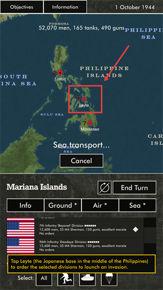 3、选择Sea Transport指令,将部队部署到Leyte区域,推进对菲律宾岛屿的进攻任务。