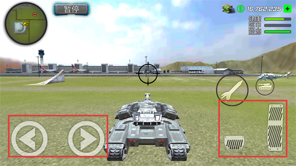 4、进入坦克驾驶界面后,通过左侧按钮控制坦克移动方向,右侧按钮控制坦克的行驶状态。