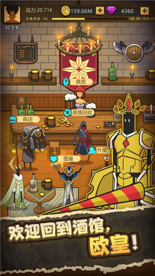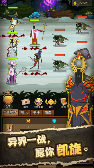 1、离线时角色自动战斗,积累经验、金币等资源,回归后可领取,资源用于升级英雄与强化装备。
