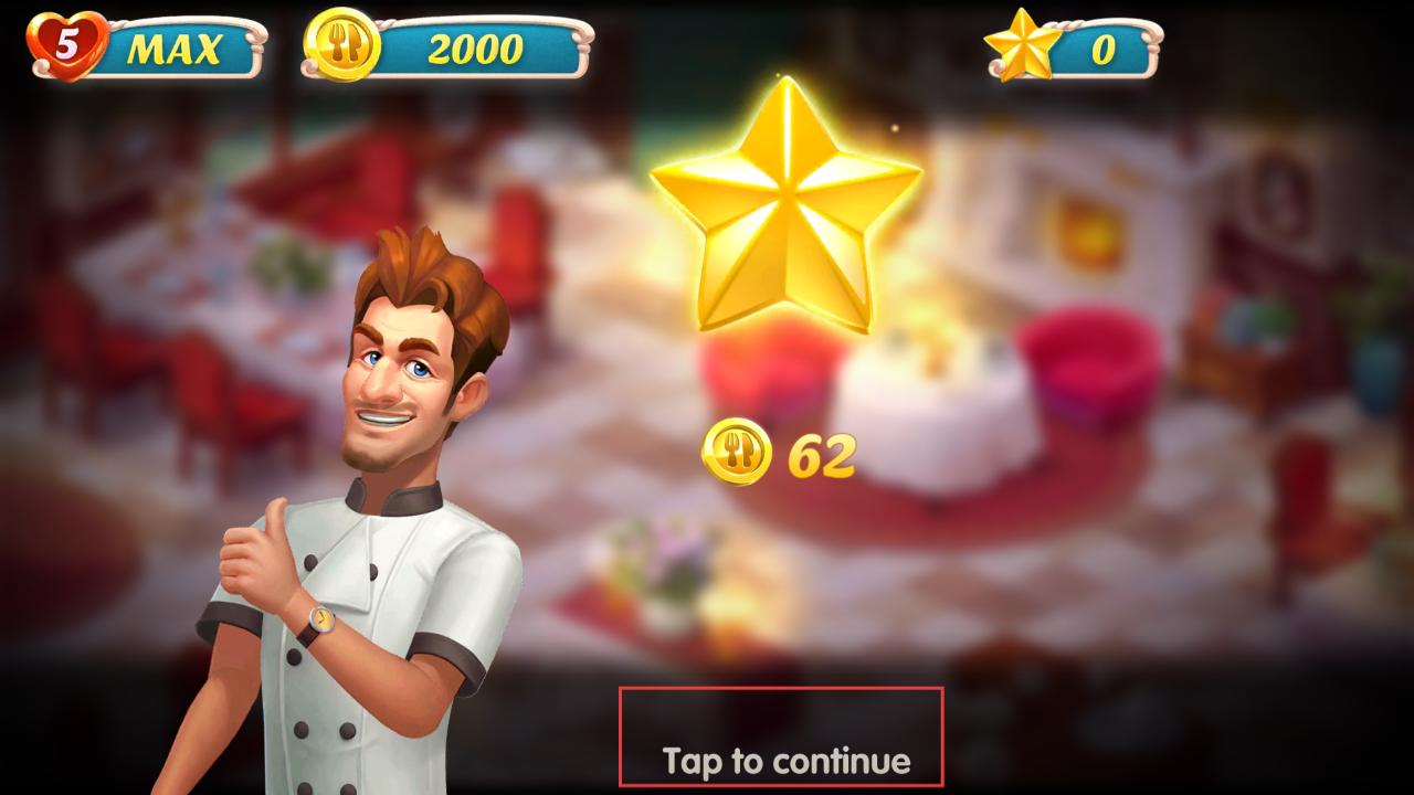4、成功完成消除任务后,会显示获得星星和金币等奖励的界面,点击Tap to continue,继续游戏进程。