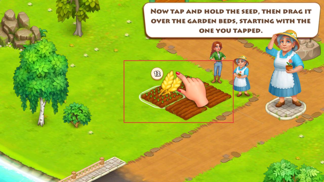 3、按照提示,长按种子并拖拽到菜园床,从点击的那一块开始,进行播种操作,为农场种植新的作物。
