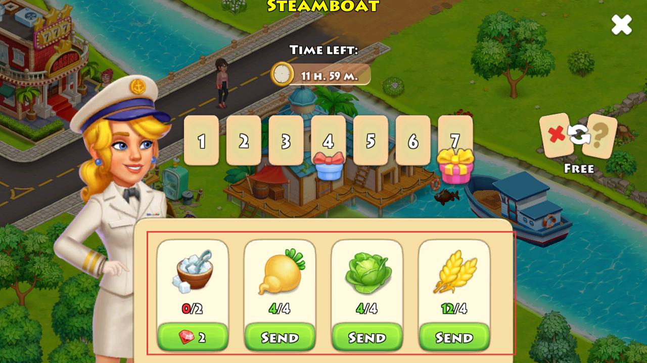 4、在轮船相关界面,可查看需要运送的物品,如盐、萝卜、卷心菜、小麦等,点击SEND按钮,将满足数量的物品运送出去,推进农场的经营流程。