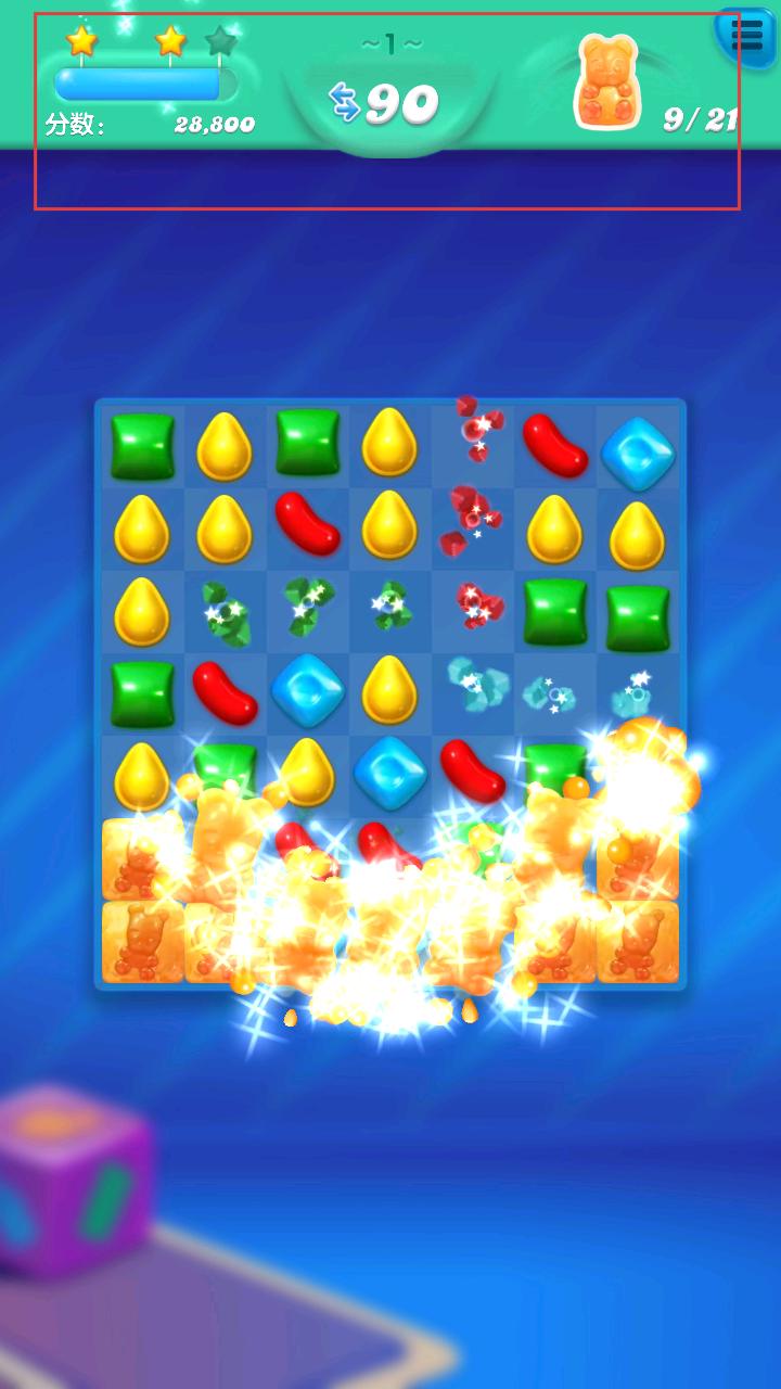 3、消除糖果时,会积累分数,同时还能完成收集指定物品等目标,看到分数和收集进度不断变化。