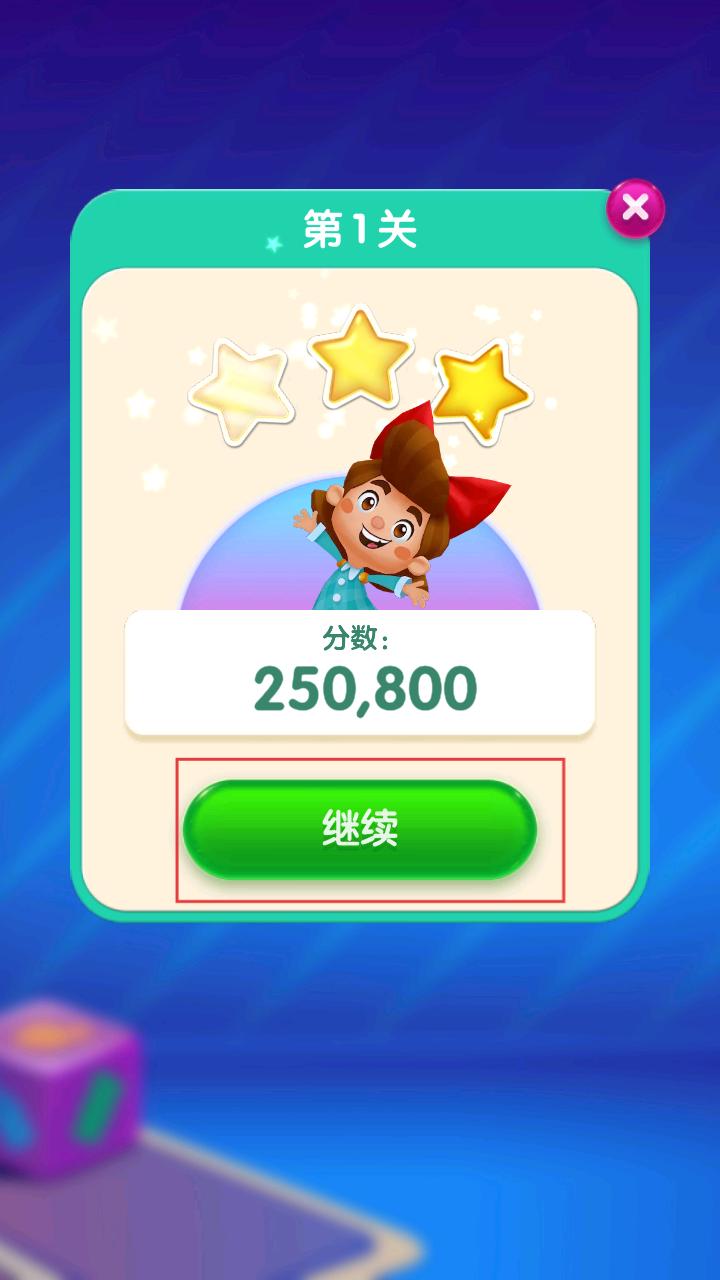 4、成功通过关卡后,会出现展示分数和星级的界面,点击继续按钮,可进入下一个充满挑战的关卡。