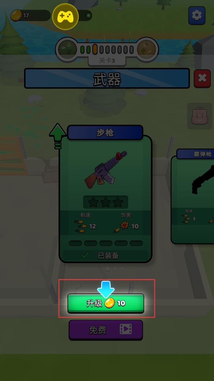 4、在武器界面可选择步枪等武器,花费10金币升级武器,提升射速和伤害,让角色在对抗敌人时更具优势,更好地在末世立足。