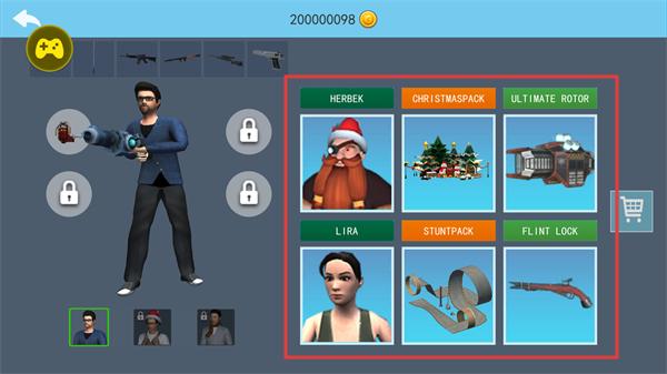1、进入游戏可选择角色皮肤,如戴圣诞帽的HERBEK,还有圣诞包、终极转子等道具,利用大量金币解锁心仪内容,开启沙盒冒险。