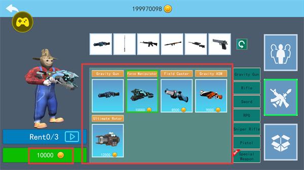 2、在武器界面可租赁重力枪、力解析器等武器,花费金币租赁后,选择枪械类武器开启战斗或建造,体验多样玩法。