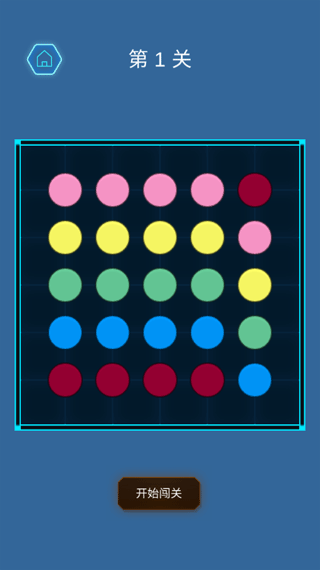 1、5x5方格搭配5种颜色25个彩球,乱序排列且同关卡重进排列顺序均不相同。